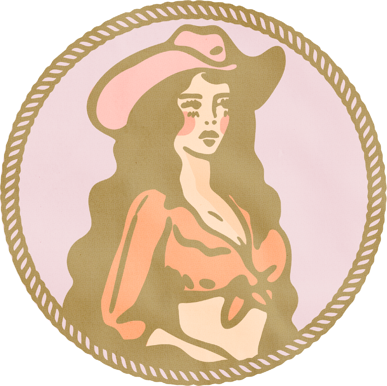 Black and white illustration featuring a woman in a cowboy hat holding a smartphone, a cactus, and text that reads "NEWS! EVEN COWGIRLS GET THE BLUES" with decorative clouds and desert plants.
